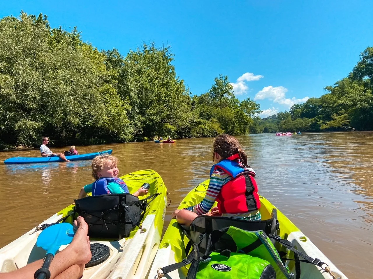 The Camping Kiddos on a kayak trip on the French Broad River